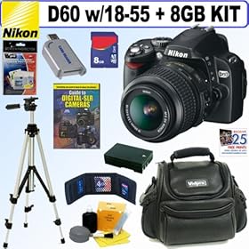 Product Description Product Description The Nikon D60 SLR Digital Camera has been designed for the consumer who wants to combine top technology with user-friendliness and creative features. The D60 provides a resolution of 10.2 effective MP's, and incorporates Nikon's exclusive EXPEED image-processing concept, which is utilized to maximize image quality and processing speed - resulting in continuous shooting capability at 3.0 fps, near instant power-up at just 0.19 seconds and high ISO sensitivity, all in a compact, lightweight body with a user-friendly ergonomic design.A common problem with SLR digital Cameras is the accumulation of dust in the cameras image box that can be introduced into the camera body when changing lenses, leading to distracting spots on your images. To combat this potential problem, the D60 includes an integrated dust reduction system which consists of an Airflow Control System that channels dust out of the image path and a vibrating, self-cleaning sensor unit shakes off any remaining dust from the camera's image sensor.The D60 is capable of use in a range of lighting conditions resulting from a wide sensitivity range of ISO 100 to ISO 1600 and offers vivid color reproduction with clear, sharp results. The camera's built-in Speedlight produces excellent balanced results thanks to Nikon's sophisticated i-TTL flash system, and also allows the use of additional remote-controlled Speedlights via a TTL Hot Shoe.The Nikon D60 is designed to simplify camera operation with a user-friendly design that includes a reduced number of buttons to allow the photographer to concentrate on taking pictures. +PLUS+ AF-S DX-Nikkor 18-55mm f3.5-5.6G VR, a lens featuring a built-in Silent Wave Motor and Vibration Reduction (VR). The AF-S DX-Nikkor 18- 55mm f3.5-5.6G VR is an affordable, and compact, 3x zoom lens covering the most frequently used focal range of 18-55mm with amazing versatility. ++PLUS++ 8GB DELUXE ACCESSORY KIT: Loaded with extremely useful accessories.